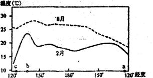 2、单选题 读“沿太平洋某一纬线表层温度水温的变化”图,回答下列各题。