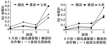 1.读图,6月份,2、3、4几个波段都不将棉花从其他作物中识别出来 ,9月份,只有4波段容易将棉花从其他作物中识别出来,D对。A、B、C错。