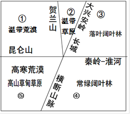 2、填空题 下图为我国植被地带性分布示意图,图中数字代表五个不同区域。读图回答下列问题。(11分)