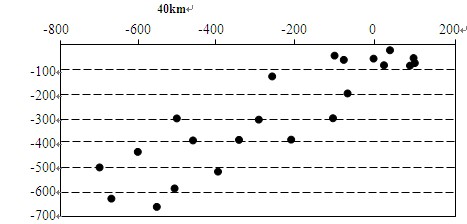 4、单选题 下图表示某地区多次地震的震中到海岸线的距离与震源深度的关系。图中纵坐标为震源深度,横坐标表示震中到海岸线的距离,其中0表示的是海岸线位置,-800表示震中位于海岸线以西800km,200表示震中位于海岸线以东200km,图中的点表示各次地震的震源位置。