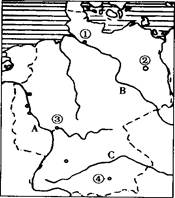 2.图示河流A表示莱茵河,流经鲁尔区,河口有世界著名港口鹿特丹;图示B河流为易北河,注入北海;图示C河流为多瑙河,为欧洲跨国家最多的河流,欧洲最长河流为伏尔加河;而经过A河流到③附近的鲁尔工业区的主要货物是铁矿。故选B项。