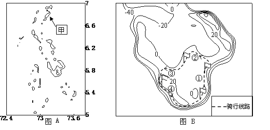 【小题1】由岛屿形状看出小强旅游的不是甲岛,是甲南部的大岛;岛屿面积不大,多山,降水不易存留,水资源不丰富;由图示等高线来看,该岛地势起伏不大,海拔20多米的小岛;小强是骑行旅游,说明岛上有交通线路,可判断主要交通工具为汽车和自行车。选D正确。