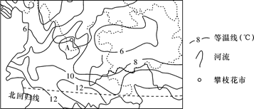 3、综合题 冬天漫漫,春天还远,下图中A地区位于世界两大裂谷带之一的攀西大裂谷上,却冬天胜似春天,被称为四川的“三亚”,它就是攀枝花。这里有富甲天下的矿产资源,浓郁的民族风情,而最有特色的莫过于“冬日三绝”,即内陆同纬度地带最温暖的阳光,生长时间最快的密集鲜花和罕见的温泉。