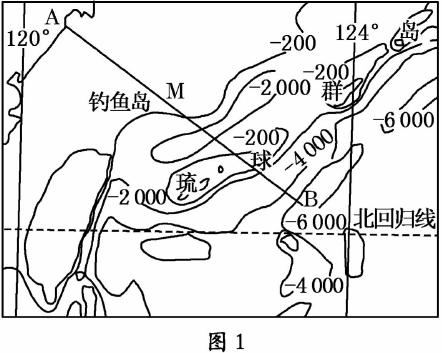 2、综合题 下图中的虚线为等深线,图中M点为我国的钓鱼岛。回答12~13题。
