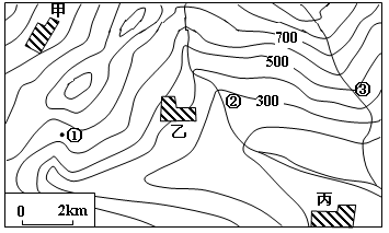 (4)甲、乙、丙三个乡村聚落,最有可能发展为城市的是?,(1分)主要原因是?。(2分)