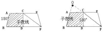 本题解析:“D地在二至日的正午太阳高度相等”,说明B、D、F在赤道上;“阴影范围和其他地方日期不同”,说明AB、CD是两条日期分界线,其中一条是180°经线(国际日期变更线),另外一条是子夜线(地方时为0时的经线)。AB、CD的经度差与CD和EF的经度差相等。若CD为子夜线,AB为180°经线,如下左图所示,则C点为晨昏线与纬线的切点,CD为夜半球的中央经线,即AB与EF的经度差为180°(赤道上全年昼夜等长,夜长为12小时,对应夜弧为180°),则F点为晨线与赤道的交点,其经度为0°,地方时为6时,那么北京时间为14时。若CD为180°经线,AB为子夜线,如下右图所示,O点为晨昏线与纬线的切点,AB为夜半球的中央经线,则AB与EF的经度差为90°(赤道上全年昼夜等长,夜长为12小时,对应夜弧为180°,而B与F点之间的夜弧为赤道上夜弧的一半),则F点为晨线与赤道的交点,其经度为135°W,地方时为6时,那么北京时间为23时。