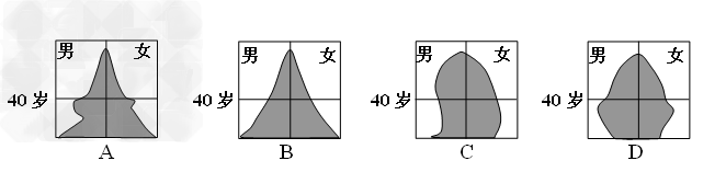 4、单选题 当大量民工流入后,台州市的人口金字塔最可能接近于下图中的