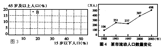 (3)根据表2提供的数据,在图3中标出A点,以表示A国15岁以下、65岁及以上人口年龄构成。
