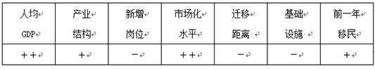 表B 1990年~2000年京津冀地区人口迁移影响因素强弱变化对比(+表示增强,-表示减弱)