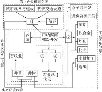 本题解析:第(1)题,结合田纳西河开发领域,电力是发展炼铝、铁合金、化工工业的基础,结合与②相关联的因素判断为发电。③④对实现农业现代化意义重大,应为田纳西河梯级开发的措施,故为防洪、灌溉。图中①是建立在与之相关措施基础之上的,应为旅游。第(2)(3)题考查田纳西河综合开发治理的效益。田纳西河流域以河流的梯级开发为核心,并结合流域内资源条件对流域进行综合开发,同时对流域的生态环境进行恢复和治理。