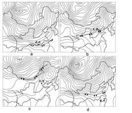 【小题1】我国的寒潮的发生过程一般是从北方向东向南推进,c图的寒潮位于我国北部边疆,b图已推移到华北地区,d图在秦岭、淮河一线,a图寒潮已到长江中下游地区,故答案选C。