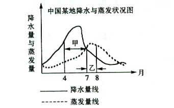 本题考查世界主要气候类型的判断。蒸发量主要与气温有关。根据图示该地7-8月份蒸发量大,位于北半球,7-8月为夏季,气温高。该地4-7月份降水量大,降水量大于蒸发量,可能为梅雨天气;而7-8月份降水量小于蒸发量,可能为伏旱天气,所以该地位于长江中下游地区,为亚热带季风气候。所以本题选择A选项。