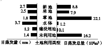 2、单选题 图为中国某河干流区不同土地利用类型的日蒸发量和日蒸发总量(各类用地面积与其日蒸发量的乘积)。读图完成下小题。
