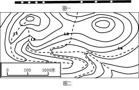 2、单选题 某运动员在自行车上安装全球定位系统(GPS),并用每1分钟自动记录一点的方式,将骑自行车所到之处记录下来。下图一为该运动员在山区公路上全力冲刺时GPS的点位记录,判断图二等高线中符合运动员行进线路的是