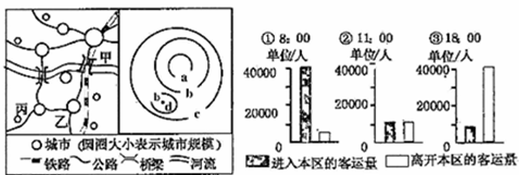 2、单选题 读某区域城市分布图、甲城市地租等值线示意图以及甲城某区域日均地铁分时段客运量统计图,回答下列各题