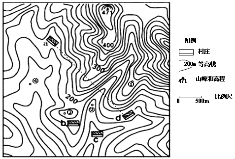 【小题2】a地处在开阔的山谷地区,集水区,易发洪水;b处北侧有一小山,不利于村子扩展;c的地势相对低凹,容易积水;d在坡度和缓,排水较好的缓坡地带,向阳,利于村落发展。选D正确。