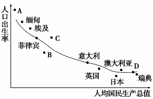 3、综合题 读“人口出生率与人均国民生产总值关系曲线”图,完成相关问题。(12分)