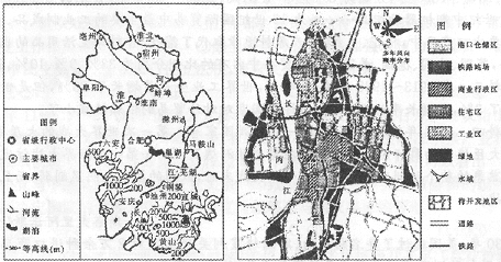 (1)读图甲,指出安徽省的城市分布特点,并说明其原因。(8分)
