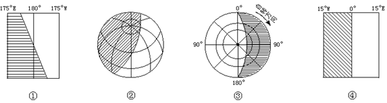 本题解析:1.阴影部分为7月6日,非阴影部分为7月7日,日界线顺地球自转方向,日期从“昨天”到“今天”的是0时的界线。所以AB是0时的经线,甲与AB相差45?,时间是3时。选择C项。