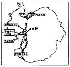 3、单选题 据报道,美国准备花5年时间,耗资1.25亿英镑修建南极“高速公路”。这条特殊的“高速公路”起点站是麦克默多,横跨罗斯冰架,越过横贯南极山脉,到达南极点,全程1600千米。读图,回答下列各题。