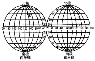 (1)甲飞机由A地起飞,先后经B、C两地至D地,请画出该飞机沿图上经纬线飞行的最短航线,并说出