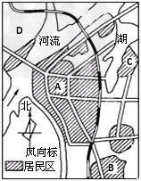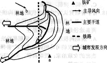 小题3:根据主导风向,钢铁厂应布局在主导风向的下风向,a位于下风向,周围有铁矿,所以a为钢铁厂。b位于盛行风向的上风向,环境优美,适合布局疗养院;c位于城区,劳动力充足,适合发展服装厂。所以本题选择D选项。