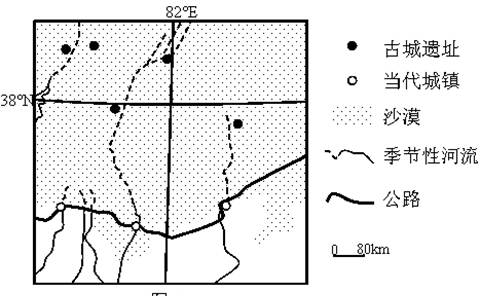 小题2:从图中的古城遗址与当代城镇相比,出现了现代城镇明显向河流的上游迁移的特点。原因可能与人口数量的增多,工农业、生活用水量的增大,上游过度用水,下游因断流而无水可用,人们不得不向河流上游迁移。故选A