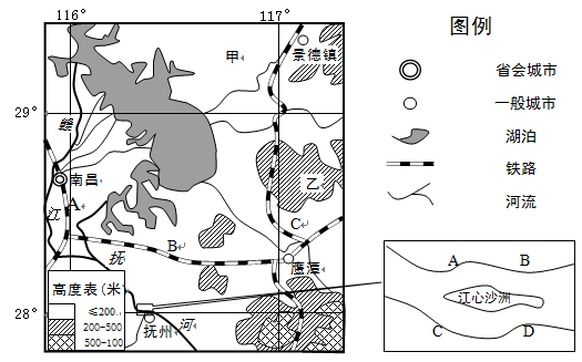(3) 抚河唱凯堤某处大坝曾发生决提,对人民的生命财产造成了巨大损失,放大图为唱凯堤部分大坝示意图,图中a、b、c、d四地中,最容易出现溃堤的是?,江心沙洲是由??作用形成。(4分)