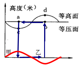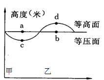 2.乙地为低压,乙地等压面向下弯曲;甲地为高压,甲地温度低于乙地,甲地为下沉气流,故甲地多晴朗天气;在水平方向上,气流由甲地流向乙地。