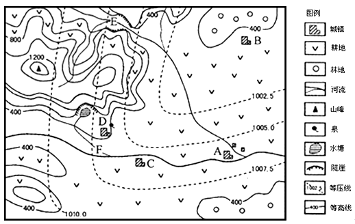 5、综合题 下图是我国东部季风区某地区等高线地形图及某时刻海平面等压线图。当冷空气缓慢进入并滞留于图中某些地区时,气温下降致使水汽过饱和会产生浓雾,并对人类的生产和生活造成影响。读图回答下列问题。(17分)