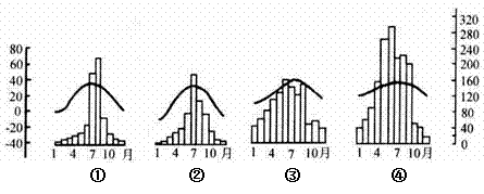 小题1:结合图中和题干信息可知,①、②、③、④分别位于我国东部的东北、华北、长江中下游、华南,四地夏季降雨均主要是与锋面活动密切相关,6月中、下旬我国东部雨带位于③所在地区,当①、②地为降雨月份时,③地正值伏旱时期;
