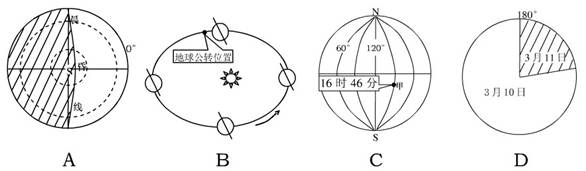 地震发生时日期为3月11日太阳直射点位于南半球并且往北移动,所以南极附近出现极昼,所以A与B错误;地震发生时北京时间为14:46,甲地纬度为150°E,所以甲地地方时为16:46,所以C正确;D选项北京时间为14:46,和北京处于同一日期3月11日的范围要远远大于3月10的范围,所以D选项错误,所以本题选择C选项。