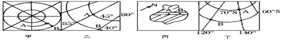 【小题2】由甲图的自转方向可知,A是位于B的西北方向,乙的经度是向西增大,纬度是向北增大,所以A也在B的西北方向,由丙图的指向标可以判断出,A是位于B的西南方向,从丁图的纬度可以看出,该图此时是上南下北,左东右西,所以A是位于B的西南方向,故选B.