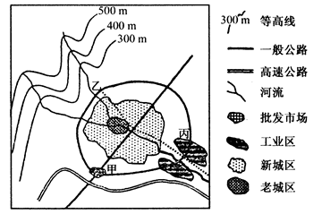 (2)大型批发市场选择在甲处的主要原因是?。(2分)