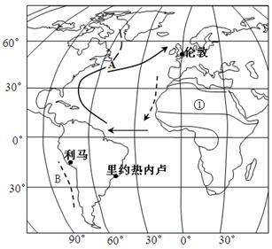 (3)图中A处渔场位于拉布拉多寒流和墨西哥湾暖流交汇处,寒暖流交汇使海水扰动,底部冷海水上泛,将营养盐类带到表层;同时,寒暖流交汇处形成水障,使鱼群聚集,形成渔场。B洋流为秘鲁寒流,对沿岸气候有降温减湿的作用。
