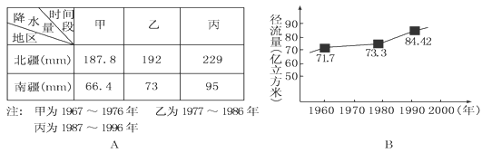 1、单选题 左下表A为北疆和南疆年平均降水量的变化情况表,右图B为阿克苏河(塔里木河的主源)年平均径流量的变化情况图。据此完成下列问题。