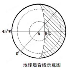 据图中0°和45°W经线可以判断地球自转方向为逆时针方向(西经度度数减小的方向即地球自转方向),A点为北极点。北极附近出现极昼现象,应该为北半球的夏半年。经线AC与45°W经线相对,经度为135°E,且为子夜线(平分夜半球,地方时为0时)。C点纬度为66°34′N,B在AC的中点,其纬度为78°17′N。