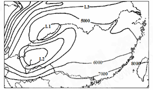 本题解析:1.根据图中等值线的分布,L1中心区的值可能为大于6000小于7000,L2的中心值可能为大于2000小于3000,两者之间的差值为大于3000小于5000。所以本题选择D选项。