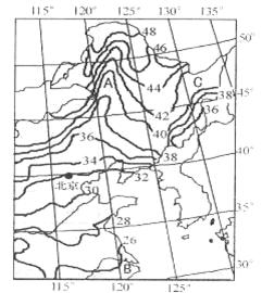 (1)A地气温年较差△T约为 ℃,影响A地等值线发生弯曲的主要因素是 。(2分)