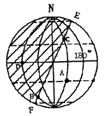 3、综合题 读“太阳光照图”(阴影表示黑夜,非阴影表示白天),回答下列问题。