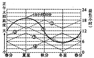 1、曲线⑤所示昼长季节变化情况,与下列哪一地方最为相近?