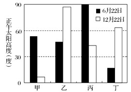 5、单选题 下图为6月22日与12月22日地球表面四地正午太阳高度。读图回答1—2题。