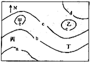 5、单选题 若该图为等高线图,a>b>c>d,甲、乙均在等高线闭合中,两地的地形最有可能的是