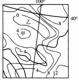 小题2:第4题,根据等值线分布规律判断:甲的气温为4°C--8°C之间;乙的气温为-4°C---0°C之间,故计算两地的温差:4°C--12°C之间。