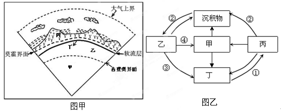 【小题1】图甲中丙是地壳,乙是地幔,丁是软流层,甲是地核,在地幔上部存在一个由塑性物质组成的软流层,是岩浆的发源地.故这次火山喷发的岩浆来自软流层丁.故选:D.