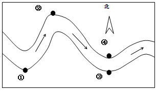 由“凸岸堆积,凹岸侵蚀”,可以直接排除④,①②③均在侵蚀岸。由于图示是在北半球,受地转偏向力影响,右岸要比左岸侵蚀强烈,可以排除②;从图上看,①比③的弯曲更明显,所以,侵蚀最严重。