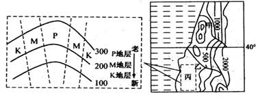 5、单选题 下图为“某大洋海岸大陆等高线地形图”,左图为丙区域的放大图,其中实线为等高线(单位:米),虚线为地层界线。读图答题。