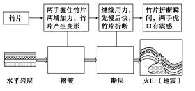 实验步骤:(1)两手握竹片两端加力,竹片产生变形。 (2)继续用力,先慢后快,竹片折断。 (3)竹片折断瞬间,两手虎口处有震感。 (4)竹片与岩石都具有“刚性”和“塑性”,竹片的受力变形过程与岩石的受力变形过程比较相似。
