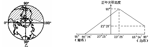 (4)根据甲图条件在乙图中绘出这一天的晨昏线,并用阴影表示出夜半球(2分)