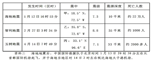 资料一 2010年三次地震的数据资料(注:甲、乙、丙代表三次地震的震中)